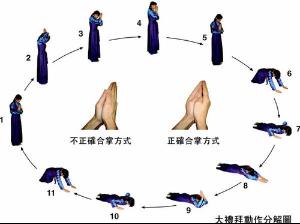 信徒们遵循这样的程序:首先取立正姿势,口中念念有词,多为诵六字真言,读作“啊嘛呢叭咪哞”,是印度佛教密宗的“真宝言”(似汉地佛教徒常诵的“南无阿弥陀佛”。一边念六字真言,一边双手合十,高举过头,然后行一步;双手继续合十,移至面前,再行一步;双手合十移至胸前,迈第三步时,双手自胸前移开,与地面平行前身,掌心朝下俯地,膝盖先着地,后全身俯地,额头轻叩地面。再站起,重新开始。在此过程中,口与手并用,六字真言诵念之声连续不断。