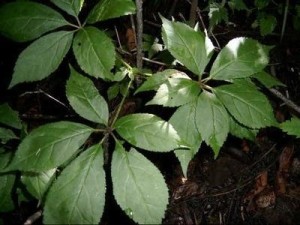 刺五加(6)灌木,高1-6米;分枝多,一、二年生的通常密生刺,稀仅节上生刺或无刺;刺直而细长,针状,下向,基部不膨大,脱落后遗留圆形刺痕,叶有小叶5,稀3;叶柄常疏生细刺,长3-10厘米;小叶片纸质,椭圆状倒卵形或长圆形[7],长5-13厘米,宽3-7厘米,先端渐尖,基部阔楔形,上面粗糙,深绿色,脉上有粗毛,下面淡绿色,脉上有短柔毛,边缘有锐利重锯齿,侧脉6-7对,两面明显,网脉不明显;小叶柄长0.5-2.5厘米,有棕色短柔毛,有时有细刺。