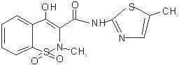 本品主要成份为美洛昔康。 化学名称:4-羟基-2-甲基-N-(5-甲基-2-噻唑基)-2H-1,2-苯并噻嗪-3-甲酰胺-1,1-二氧化物 化学结构式: 分子式:C 14H 13N 3O 4S 2 分子量:351.40