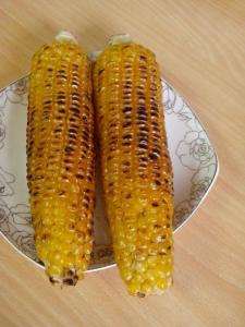 (4)将烤网洗净放在碳火上,放入由竹筷固定好的玉米,先烤三分熟后,再涂上调味料B,继续烤,并须翻动玉米,以能让玉米能入味,烤至熟透并微焦香,即可食用。 玉米可以撒上芝麻或起司烤,味道也很好。