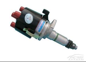 汽油机点火系统中按气缸点火次序定时地将高压电流传至各气缸火花塞的部件。在蓄电池点火系统中,通常将分电器和断电器做在同一轴上,并由配气凸轮轴驱动。它还带有点火提前角调整装置和电容器等。断电器的断电臂用弹簧片使触点闭合,用断电凸轮使触点开启,开启间隙约为0.30~0.45毫米。断电凸轮的凸起数与气缸数相同。