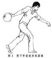 规则规定运动员滚球时必须站在起点线后面,不得超越或触及起点线,违例判失掉 1次滚球机会。起点线后面为助跑区,长 4.572米。滚球动作规定用下手前送方式,采用其他方式滚球为违例(图1)。一般设裁判员1人,负责检查运动员是否违例并登记双方分数。设有违例和得分显示器自动装置的场地,可不设裁判员