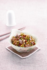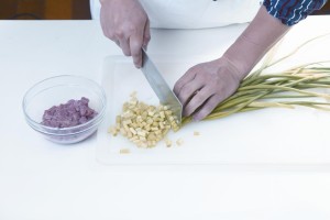 1.牛里脊肉洗净切成细丁,用料酒、1 茶匙盐、生粉腌制片刻,蒜薹洗净切成半厘米长的小丁。