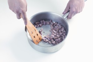 2.锅中放油烧至六成热,放入姜、蒜末爆香,放入牛里脊肉丁炒至变色后盛出。