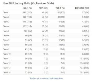 2019年NBA选秀实行多年的旧乐透抽签制度因近年多队的摆烂而被修改。2018年9月NBA通过了新的乐透抽签制度。新制度降低了战绩较差球队获得高顺位选秀权的概率,同样让那些战绩优秀的球队增加了概率。这一新制度将于2019年乐透抽签仪式上执行。