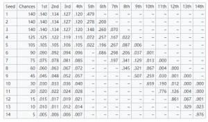 下图为新制度下各队抽中各顺位选秀权的概率: