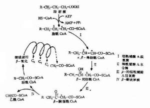 脂肪酸的β-氧化肝和肌肉是进行脂肪酸氧化最活跃的组织,其最主要的氧化形式是β-氧化。此过程可分为活化,转移,β-氧化共三个阶段。