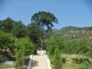 寺的西岩山腰,一株巨松,高逾十丈,遮天盖地,枝繁叶茂,身姿婆娑,一派生机盎然,因之曰“青松伞盖”,名不虚传。民间传说,日本鬼子曾欲伐而盗之,破而已有。谁料,钢锯刚刚举起, 对锯部位之鲜血便流淌不止,喷出外面,侵略者见状吓呆,拔腿就逃,民皆狂欢,惊呼神树。向南眺望,各种树棵,漫山遍岭,蒙络摇缀,参差披拂,风涛似籁,鸟鸣如簧,响声交合,回荡苍穹,整个山间就像一个翕动燮和的天地。山麓有古雅的铁梁桥,悉数用规整方石堆砌而成,横穿四根碗口粗铁棍作梁,故名。沿梁而过,低首俯瞰,真有“桥横索寒”之感,因而被誉为该寺奇观之一。 过桥直上,为一开阔地界,乃建前殿,崛地耸立,悬山脊顶,四角撅起,下垂铜铃,上戏猴禽。殿内正面为古印度须弥山四天王金刚塑像,东方持国天王,着白弹瑟而自适;南方增长天王,利剑在握而威武;西方广目天王,腾云驾雾而哧龙;北方多闻天王,暴风骤雨而镇定,俗称护世四天王。个性明显,各有千秋,面目狰狞,身形高大。周环小塑像,体态丰满,衣纹流畅,缨络玲珑,佩饰精巧,所有塑像眼目炯炯有神,望之栩栩如生。过前殿,跨小院,一则为正殿,此正殿又名断梁殿,传为木匠鼻祖鲁班建殿时,山摇地撼,天晴不雨,羊狗冒汗,砖瓦飞动,数夜不宁,廿日落成。他将此殿正中大梁有意裁短,故一端不及山墙,只好向下倾斜而殿却经年牢固,岿然挺拔。据说倘若阴天,这梁便自动伸起,与墙垛中立柱吻合,未见雨脚,如逢晴天,则又自动缩短,恢复鼓斜,因而被誉为此寺奇观之二,还有人把它称为“斜正梁殿。” 殿前有花栏石桥,龙柱狮桩,立于石桥前端,对称成配,设计和谐,后面涧壑悬泉,山丹花丛,虬藤葳蕤。远不见庙,近不见山,上不见天,下不见地,唯见万株青松作覆盖,绿色云锦翳如被。难怪有人将此种景象形容为南山之上的“海市蜃楼”、“寺庑浮世”。