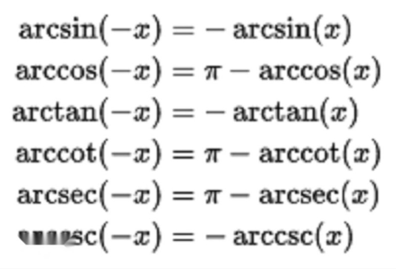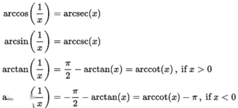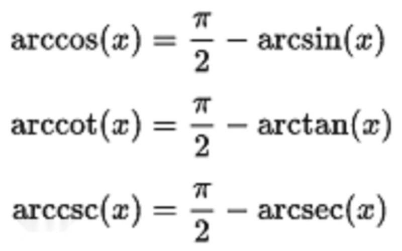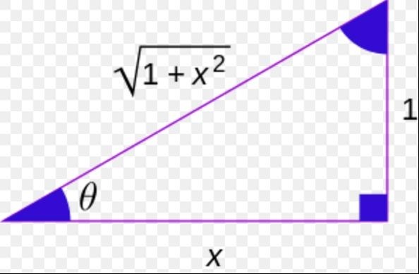 反三角函数的三角函数如下式所示。 推导它们的一个快速方法是通过考虑直角三角形的几何形状,其长度为1的一侧,长度x的另一侧(0和1之间的任何实数),然后应用毕达哥拉斯定理和三角比。
