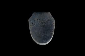 商周石钺长7.01厘米,宽5.50厘米,厚1.77厘米,砂岩,灰色,不透明,平顶,顶上无銎,有肩,器两面微凸,刃部为长舌形,圆刃较厚,正面肩上有一栏,栏内饰9个斜方格纹,在中间四格内饰圆圈纹,栏下中部饰垂叶三角纹,两边饰双重波曲纹,器两侧磨成长方形,背面无纹饰。器物造型明快简洁,花纹装饰清新朴实。 | ![]() |