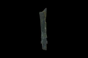 商周连孤刀铜戈长21.3厘米,宽5.17厘米,厚0.43厘米,青铜质,器为三角形无胡直内戈。尖峰,援身窄长,刃部有对称的七组锯齿状齿,近连弧形的曲刃。锋至穿间有中脊,援末近方,有一圆穿。长方形内。但因刃部并未开口,也未见使用痕迹,应不具有兵器的实用功能,而是祭祀时的仪杖用品之一。 | |