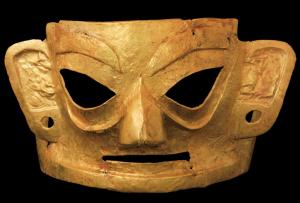 商周小金面具长4.89厘米,宽0.03厘米,高3.6厘米,金质,面具整体呈脸谱状,形体较小,系在模具上捶揲成形。大致呈倒三角形,表现范围上方只限于额部,两侧耳廓,下方只及下颌。人面圆脸圆颐,眉毛略微凸起,中央宽而两端收束,好似新月。双眼镂空,形态如梭,上下眼帘大致对称。鼻梁高直,鼻翼与颧骨线相连。嘴巴镂空呈微张之态,略呈笑意。耳朵外展,耳垂有凹入但未贯通穿孔。整个脸部丰满,表情温和,具有一定写实风格[8]。 | ![]() |