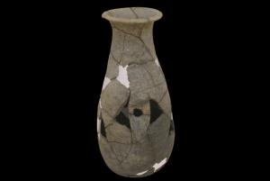 商周镂孔纹陶器座底径15.63厘米,顶径10.71厘米,高33.2厘米,陶质,灰色,夹砂陶。整体呈瓶状,圆唇,侈口,束颈,斜肩,弧腹,中空,无底,腹壁中部有四个镂孔图案,形如眼睛,造型精美,应为器座。 | ![]() |