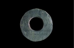 商周石壁直径10.3厘米,孔径4.17厘米,厚1.06厘米,蛇绿岩,黑色,不透明。整体平面略呈圆盘状,器形较小,扁平,近中间一圆孔,孔径较大,孔壁留有单面管钻痕迹,环面较宽,环面及环缘均打磨过,环缘较规整。 | ![]() |