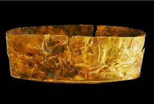 商周卷云纹金喇叭形器直径9.98厘米,高3厘米,厚0.08厘米,金质,整体呈喇叭状,上小下大,器身较高,上下两面为圆形,小平顶,中空,周壁向下逐渐外侈。腹壁上等距离分布着三朵卷云纹,纹饰线条流畅,较具美感。表面抛光处理,比较光亮,内壁未经处理,较为粗糙[8]。 | ![]() |