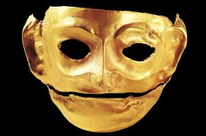 商周大金面具长20.5厘米,宽10.4厘米,高10.7厘米,厚0.08厘米,金质,整体呈立体脸谱,系在模具上捶揲成形,眼睛、鼻子、嘴巴、耳朵则采用剪切而成。表现范围上限于额部,下方及下颌。面相近方,平额,眉毛略微凸起,中央宽而两端收束,好似新月。眼眶较大,双眼镂空约呈菱形,上眼帘呈弧形,下眼帘深凹。鼻梁高直,鼻翼与颧骨线相连。嘴巴镂空呈微张之态,略呈笑意。耳朵外展,上宽下窄,上半部分凹入,耳垂穿孔。嘴巴微张,呈狭长方形,下颌平直。整个脸部丰满,表情威严,具有一定写实风格。表面打磨光亮,里面未经打磨,较为粗糙[8]。 | ![]() |