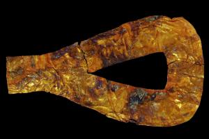 商周三角形金器长25.8厘米,宽14.8厘米,高0.43厘米,厚0.03厘米,金质,外形大致呈一个三角形,中央三角形镂空,一端接长方形柄部,边缘内卷,素面。整体系捶揲成形,应垫有模具。目前国内尚未发现过类似的器物,其功用不详。从形制特征看,三角形金器应是包裹或镶贴在某种器物之上的[8]。 | ![]() |