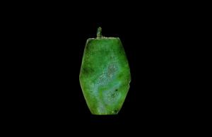 商周玉神人面像长3.20厘米,宽2.06厘米,厚0.27厘米,玉质为含水磷酸盐、碳酸盐的多金属混合矿物料。墨绿色,粘接铜锈。人面像两面对称,人像为侧面造型,长眉,大眼,钩鼻,阔口,口内三齿,方颐,大尖耳,头戴冠饰。颈部一下残缺,功能不明。 | |