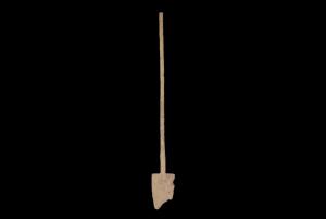 商周木耜长142厘米,宽17.0厘米,厚2.72厘米,通体由一块整木凿制而成,形如现代铲子,较长,圆形长柄,长梯形器身,器身厚度不等,前厚后薄。通体米黄色,木纹清晰。器保存完好,仅刃部略有缺损。 | ![]() |