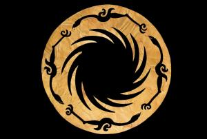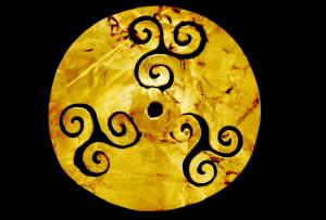 商周太阳神鸟金饰外径12.53厘米,内径5.29厘米,厚0.02厘米,金质,整体为圆形,厚度均匀,极薄。图案分为内外两层,均采用镂空的方式表现。内层图案中心为一没有边栏的圆圈,周围等距分布有十二条顺时针旋转的齿状芒,芒呈细长獠牙状,外端尖,图案好似空中旋转不停的太阳。外层图案由四只相同的逆时针飞行的鸟组成,它们等距分布于内层太阳的周围,引颈伸腿,展翅飞翔,爪有三趾。首足前后相接,向着同一方向飞行。飞行的方向与内层太阳芒纹的方向相反。整器采用捶揲、剪切和打磨等多样加工手法,正面打磨光亮,背面未经打磨,较粗糙[8]。 | ![]() |