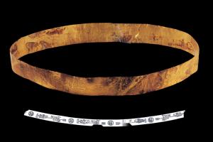 商周人面鱼鸟箭纹金王冠带外径20.4厘米,高2.83厘米,厚0.03厘米金质,整体呈窄宽圆环形,上大下小。纹饰錾刻在金带表面,由四组相同的图案组成,每组图案分别有一鱼、一箭、一鸟和一人面。鱼体宽短,大头圆眼,嘴略下钩,嘴上有胡须,身上鳞片刻划逼真,近尾处作折尺形,鱼身上有一道较长的背鳍,身下有两道较短的腹鳍,鱼尾较宽作"丫"形,两边尾尖向前卷曲。箭纹的箭杆较粗,带尾羽,箭头深插于鱼头内。鸟纹位于箭羽与鱼之间的箭杆后方,鸟头与鱼头朝箭羽方向。鸟粗颈,长尾,大头,钩喙,头上有冠,翅膀微展,腿爪前伸,三根并列的圭形尾羽组成长尾,尾部平直且与身体的方向平行。人面纹为圆形,有两道圆圈构成脸的轮廓,中间为对称的双圆眼,上面为略成方形的眉毛,下面为抽象的嘴巴。整个纹饰线条流畅[8]。 | ![]() |