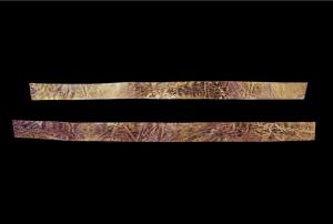商周玉纹金带长21.5厘米,宽2厘米,厚0.04厘米;2号长21.7厘米,宽2.1厘米,厚0.04厘米金质,整体呈长条状,大致可以围合呈圆形冠带。表面平整,呈下短上长的倒梯形。纹饰采用錾刻和阴刻相结合,正面由两条首向外,尾相对的鱼纹组成。鱼嘴有似鸟喙的长吻,吻前端上翘略后钩,下缘作波浪形曲线,梭形眼,尖桃形腮,背、腹部均有鳍,背鳍一长一短,腹鳍一前一后,形态前尖后圆,身与尾之间以折线纹分隔,“Y”形鱼尾向两侧展开,鱼身无鳞,刻画几道水波状短线[8]。 | ![]() |