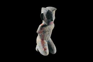 商周跪坐石人像长8.73厘米,宽10.63厘米,高22.7厘米,蛇纹石化橄榄岩,石中含有大量细分散的粉粒状磁铁矿石及方解石,使石外表呈黑色条状、褐色状斑及白色划纹。人像外貌为一裸体赤足的男性,呈跪坐姿态。其头顶发式中分,四角高翘,脑后有辫发两束。两束并为一股,直垂于后背的双手之间,脸型较长,棱角分明,宽额,额头中部有脊,眉弓突起,双眼模糊,以彩绘形式描绘,圆睁,平视前方,鼻梁高且宽,阔嘴紧闭,涂鲜艳的朱砂,颧骨高起,面颊深凹,整个表情苦涩。两耳横张,耳垂有穿孔。裸身,前倾,圆肩短颈,双手被绳索反缚,手指粗壮,掌心向外,未见大拇指。双膝屈跪,双脚着地,臀部置于脚后跟上,赤足。推测可能是属于当时金沙王国的异族人物形象。 | ![]() |