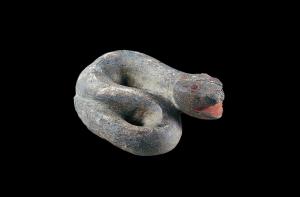 商周石蛇长42.8厘米,宽11.33厘米,高6.5厘米,砂岩,灰黑色,不透明。蛇身盘绕呈"S"形,蛇首呈三角形,头微昂,口内涂朱,圆眼向上,黑色眼眶,眼珠涂朱,黑色瞳孔,眼珠与瞳孔间为白色。扁嘴大张,蛇信上卷,眼后与颈之间朱绘一道弧线,其身中部一条凸起的脊棱从头至尾,曲绕的蛇身还组成两个椭圆,使构图显得极其简练流畅。金沙石蛇出土时有的和石虎、石人、玉璧伴存,有的与玉质礼器、金器等一起埋藏,说明石蛇可能是古蜀国巫术活动中的重要道具之一,在古代宗教祭祀活动中起着较为重要的作用。 | ![]() |