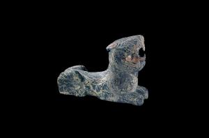 商周石虎长28厘米,宽8.88厘米,高20.03厘米,蛇纹岩,灰黑色,石料上有大量的灰白色条状斑纹,石料的自然斑纹近虎斑纹。虎呈卧姿,昂首,嘴巴大开,正视虎口呈方形,四角各雕一个硕大的三角形犬齿,上、下颌各雕四颗门齿。喉部保留管钻痕,侧视虎的口呈三角形,上、下颌各雕三颗门齿,虎口的后部两侧又各有一个小钻孔。虎额的两侧各阴刻五道胡须,其后阴刻两个"目"字形眼和三角形卷云耳,两耳间又阴刻四条平行线纹。直颈,虎头和颈较虎身大,略显夸张。前爪前伸,后爪向前弯曲卧于地上。臀部有一圆形小孔。腿与身之间往臀部延伸形成一条凹槽,与臀部孔下的一条凹槽将臀部分为六部分。石虎威猛而狞厉,自然而拙朴,在静态之中蕴藏着动感,生机勃勃,充满力量。 | ![]() |