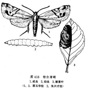 杨白潜峨在河北(易县)、山西(忻县)1年发生4代;辽宁1年发生3代,均以蛹在茧内越冬。在河北和北京一带,除落叶上有少量越冬茧外,多数在欧美杨和柳树的树皮缝内、唐柳的树干鳞形气孔上越冬。翌年4月中旬,杨树放叶后,成虫羽化(辽宁在5月下旬、忻县在5月中旬出现越冬代成虫)。 成虫羽化时,先咬破蛹壳,在蛹壳表面(茧表面)出现1个小口,然后成虫钻出蛹壳爬行,通常先停留在杨树叶片基部腺点上(可能吸食腺点上的汁液)。有趋光性。羽化当天即可交尾产卵。交尾多在 10—19时,以 11—16时最盛。交尾时间达 20分钟左右。雌虫交尾后在叶面静止约半小时,然后来回爬行,寻找适宜的产卵部位。卵一般产在不老不嫩的叶正面,贴近主脉或倒脉,与叶脉平行排列。每个卵块2-3行,每行2-5粒,每块卵5-15粒。卵粒很小,一般肉眼不易发现。每头雌虫产卵量最少23粒,最多74粒,平均为49粒。卵的孵化率很高,每个卵块所有卵料都在同一天孵化。第一代卵期为10天,第H至第四代卵期4-10天,大多数6—7天。 幼虫孵出时,从卵壳底面咬破叶片,潜入叶内取食叶肉。幼虫不能穿过叶脉,但老熟幼虫可以穿过测脉潜食。被害处形成黑褐色虫斑,虫斑逐渐扩大,常由2-3个虫斑相连成大斑,往往 1个大斑占叶面的 1/3-1/2。幼虫老熟后从叶正面咬孔而出,寻找化蛹场所,幼虫停留片刻,头部左右摆动,吐丝结“工”字形茧,经过1天左右化蛹。越冬茧以树干上树皮裂缝中为多,生长季节多在叶背面。单株树干上的茧绝大多数集中在树干阳面。幼苗、幼树树干上迄今没有发现茧。大部分英分布在直径 8 cm以上的树干上,树皮光滑的树干上很少有茧。各代蛹经历日期分别为:第一代9-14天,多数11—13天(占对.85%);第二代7—11天,多数8-9天(占 78.30%);第三代7-11天,多数8-10天(占 85.26%)。 据山西忻县观察此虫世代区分不明显,在一年里杨白潜蛾4个虫态同时出现7次,分别在6月中旬、6月下旬、7月上旬、8月中旬、8月下旬、9月上旬和9月中旬。 天敌有寄生蜂和寄生蝇,寄生率为16%。