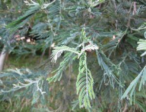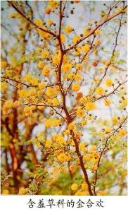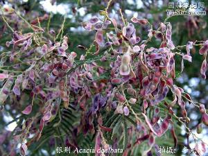 常绿乔木,高约25米,树干较直,树皮灰绿或灰色;二回羽状复叶,偶数,小叶线形,银灰色或浅灰蓝色。头状花序,具小花30-40朵,花黄色,有香气。荚果长带形,长3.5-11厘米,果皮暗褐色,密被绒毛。种子卵圆形,黑色,有光泽。