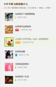 中秋节前夕,一项由“ 2013 热门微博排行榜”发起的“中秋为妈妈做什么”的投票活动引爆网络,投票结果显示:“从生活小关怀开始比如给妈妈梳梳头”在“买宠物”、“送首饰”、“包红包”等众多选项中脱颖而出,以领先的投票率高居榜首,成为中秋最受追捧的尽孝方式。对此,谭木匠梳心顺发第一时间推出微活动“中秋佳节为妈妈领取一把谭木匠梳子吧”免费发送 200 把木梳。一时间,“给妈妈梳头”、“爱,从头开始”成为这个中秋最触动人心的语言,浓郁的回归感和东方价值观正在被唤醒,人们纷纷通过各种平台和形式表达对“给妈妈梳头”的赞许和支持。