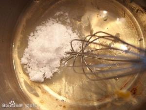 将C中的蛋白和盐,一起打至湿性发泡。然后分三次把C中的糖倒入,打至硬性发泡。
