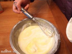 将B慢慢倒入A,边倒边搅拌直到均匀。然后再加入1/3的筛好的面粉。然后重复这个步骤两次。
