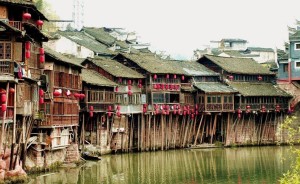 吊脚楼是湘西民居中颇为流行的一种传统建筑形式,土家、苗、汉等民族都有建吊脚楼的习俗,以土家山寨中最为常见。吊脚楼的形成,既有气候环境的因素,也有一定的历史成因。湘西雨水多,云雾多,空气潮湿,加之山中野兽、毒蛇出没,为适应山区环境,古时即有干阑式建筑。后逐渐演变而成吊脚楼。