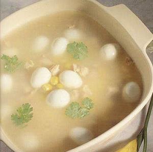 4、待米汤浓缩后冲入鹌鹑蛋液中,搅匀;