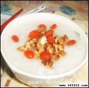 《中国益寿食谱》之延年益寿食谱(一)补阳益寿----胡桃粥。 胡桃也叫核桃,核桃仁中含有多种维生素、糖分以及各种矿物质。此外,核桃仁中植物脂肪和蛋白质的含量非常高,其中脂肪含量高达70%,蛋白质占17%—27%。另外在核桃仁中不仅含有钙、铁、磷等元素,还含有锌、锰、铬等人体不可缺乏的矿物质。多种维生素及蛋白质、矿物质,都是有利于容貌健美的营养物质。而核桃仁所富含的植物脂肪中的亚油酸,更被视为滋味润肌肤的美容剂,它可以令皮肤滋润光滑,富于弹性。