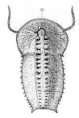 纳罗虫是一种奇特的三叶虫,它没有胸节,外壳尚未矿化,只有头部和尾部。 背甲分头尾两部分,头甲半圆形。尾甲半长椭圆形,纳罗虫是海底爬行泥食性无脊椎动物。头甲两后基角刺状,尾甲具侧刺,两个较大的后尾刺,后尾刺之间另具3到4个小刺。