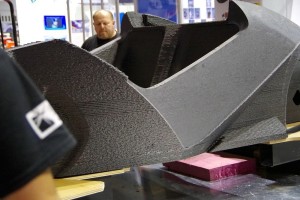 2014年10月29日,在芝加哥举行的国际制造技术展览会上,美国亚利桑那州的Local Motors汽车公司现场演示世界上第一款3D打印电动汽车的制造过程。这款电动汽车名为“Strati”,整个制造过程仅用了45个小时。Strati采用一体成型车身,最大速度可达到每小时40英里(约合每小时64公里),一次充电可行驶120到150英里(约合190到240公里)。Strati只有49个零部件,动力传动系统、悬架、电池、轮胎、车轮、线路、电动马达和挡风玻璃采用传统技术制造,包括底盘、仪表板、座椅和车身在内的余下部件均由3D打印机打印,所用材料为碳纤维增强热塑性塑料。Strati的车身一体成型,由3D打印机打印,共有212层碳纤维增强热塑性塑料。辛辛那提公司负责提供制造Strati使用的大幅面增材制造3D打印机,能够打印3英尺×5英尺×10英尺(约合90厘米×152厘米×305厘米)的零部件。[29]