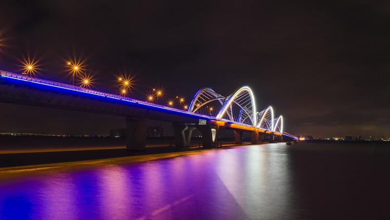 九堡大桥全长1855米九堡大桥全长1855米,主航道桥段650米,采用55米+2x85米+90米(北侧引桥)+3x210米(主航道桥)+90+9x85+55米(南侧引桥)跨径布置;其中,主桥上部支承跨径采用188米+22米+188米+22米+188米组合米布置,桥面宽度31.5米,主桥根据结构需要加宽至37.7米,行车道单向净宽11.75米,两侧各设置3米宽慢行道。