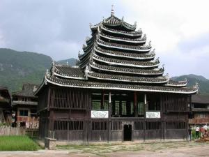 侗族有三大国宝——鼓楼、花桥和大歌。鼓楼是侗寨的标志,有侗寨必有鼓楼。鼓楼模仿杉树形状建 造,在侗寨中属高层建筑,因为楼上置鼓得名,是侗族人民遇到重大事件击鼓聚众、议事的会堂,平时是村民社交娱乐和节日聚会的场所。侗族的文化与鼓楼密不可分,重大的活动都在鼓楼里举行,鼓楼是侗族文化的载体和精华,因此,侗族文化又叫鼓楼文化。风雨桥的建设即利于交通、休息避雨、会友、观赏江面风景,同时可美化侗寨环境,所以,风雨桥又叫花桥。