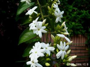 毛茉莉(5)攀援灌木,高1-6米。小枝细长,弯曲,圆柱形,密被黄褐色绒毛,后渐脱落。叶对生或近对生,单叶,叶片纸质,卵形或心形,长3-8.5厘米,宽1.5-5厘米,先端渐尖、锐尖或钝,基部心形或截形,上面光滑或被短柔毛,下面疏被短柔毛至密被绒毛,叶脉有时在上面凹入,下面凸起,侧脉3-6对;叶柄长5-10毫米,近基部有关节,被绒毛。