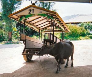 由布岛拉水牛车的水牛,是1932年从台湾带去参予耕作的。最初是从台湾带去一对水牛,公的“大五郎”和母的“花子”,后陆续繁衍有了现在岛上约35头的水牛。这两只水牛的名字现在被刻在纪念碑并立于岛上,岛上也贩卖许多水牛相关的纪念品。