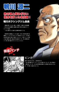 鸭川源二,鸭川拳击馆会长 ,拥有日本优胜冠军的鸭川拳击馆的经 营者。虽然他的训练非常严格,却能发掘一步与鹰村自身优秀的潜质,扩展其技术,在他的恰当指导下,引导他们走上冠军之路。