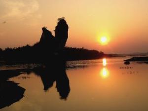 最动人处,是夕阳刚好落在断裂处时,残阳染红了满天的云霞,映红了漠阳江面,几个打渔的老翁撑起船,迎着夕阳高高抛起了鱼网……。一幅夕阳打渔图跃然入眼。置身于胜似画境的此处,你早已忘却了江水的流动,时光的匆匆,不得不感叹:此景只应天上有,人间难得几回寻。正是: