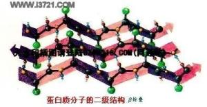 β-折叠(β-sheet) 是蛋白质中的常见的二级结构,是由伸展的 多肽链组成的。折叠片的构象是通过一个 肽键的羰基氧和位于同一个 肽链或相邻肽链的另一个酰胺氢之间形成的 氢键维持的。氢键几乎都垂直伸展的肽链,这些肽链可以是平行排列(走向都是由N到C方向);或者是反平行排列(肽链反向排列)。