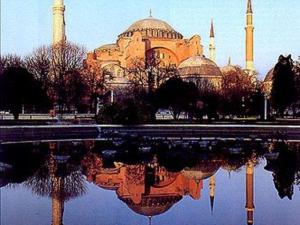 圣索非亚大教堂是拜占庭式建筑的代表作,创造了以帆拱上的穹顶为中心的复杂拱券结构平衡体系。是世界上唯一由神庙改建为教堂、并由教堂改为清真寺的圣索菲大清真寺。圣索菲亚大教堂是330年时由君士坦丁大帝修建的,6世纪时查士丁尼大帝把教堂改建成现在的模样。奥斯曼帝国时期,圣索菲亚教堂改建为清真寺,周围矗起四座高塔。教堂主体为长形,内壁全用彩色大理石砖和五彩斑斓的马赛克镶嵌画装点铺砌。