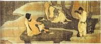 韩干出身贫贱,少年时代就在一家酒肆做工。一次,韩干给王维府上送酒,正好王维有事外出,韩干等得无聊,就在地上随便画了些马的动态。王维回来后发现韩干画的马表现出非凡的绘画才能,此后推荐他去曹家学画,并且在经济上给予很大的帮助。经过十余年艰苦学习,终于成为一位有名气的画家。 韩干画马