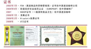 厂家和产品荣获:全球质量认证、FDA(美国食品和药物管理局)、EUREPGAP(欧盟良好农业规范认证)、HACCP证书、清真证书、等荣誉称号。