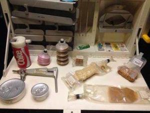 俄罗斯供应的食物很多是罐装的,加了蔬菜的羔羊肉,掺有大麦的牛肉(像一种夹肉面包),鲟鱼和鸡肉饭。我们这里有微波炉,可以加热罐头,然后用起罐器将罐头打开,但是罐头盖不能取下(以免飞得到处都是)。罐头上没有可以将他们固定在桌子上的搭扣,所以在吃罐头时无法将它固定住。如果你打算腾出手的时候,你可以往罐头底部倒一些水,这样罐头就可以粘在桌面上。